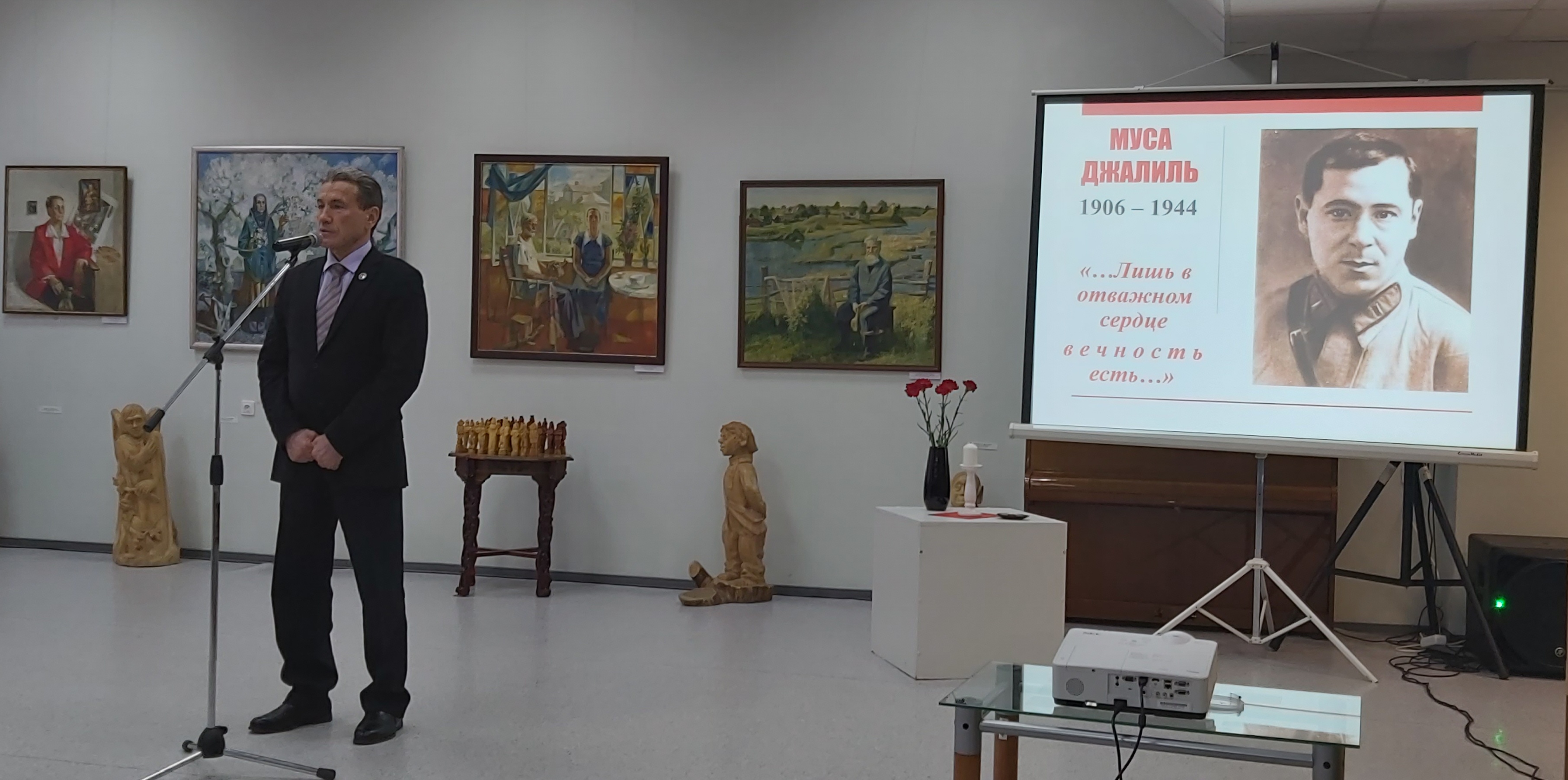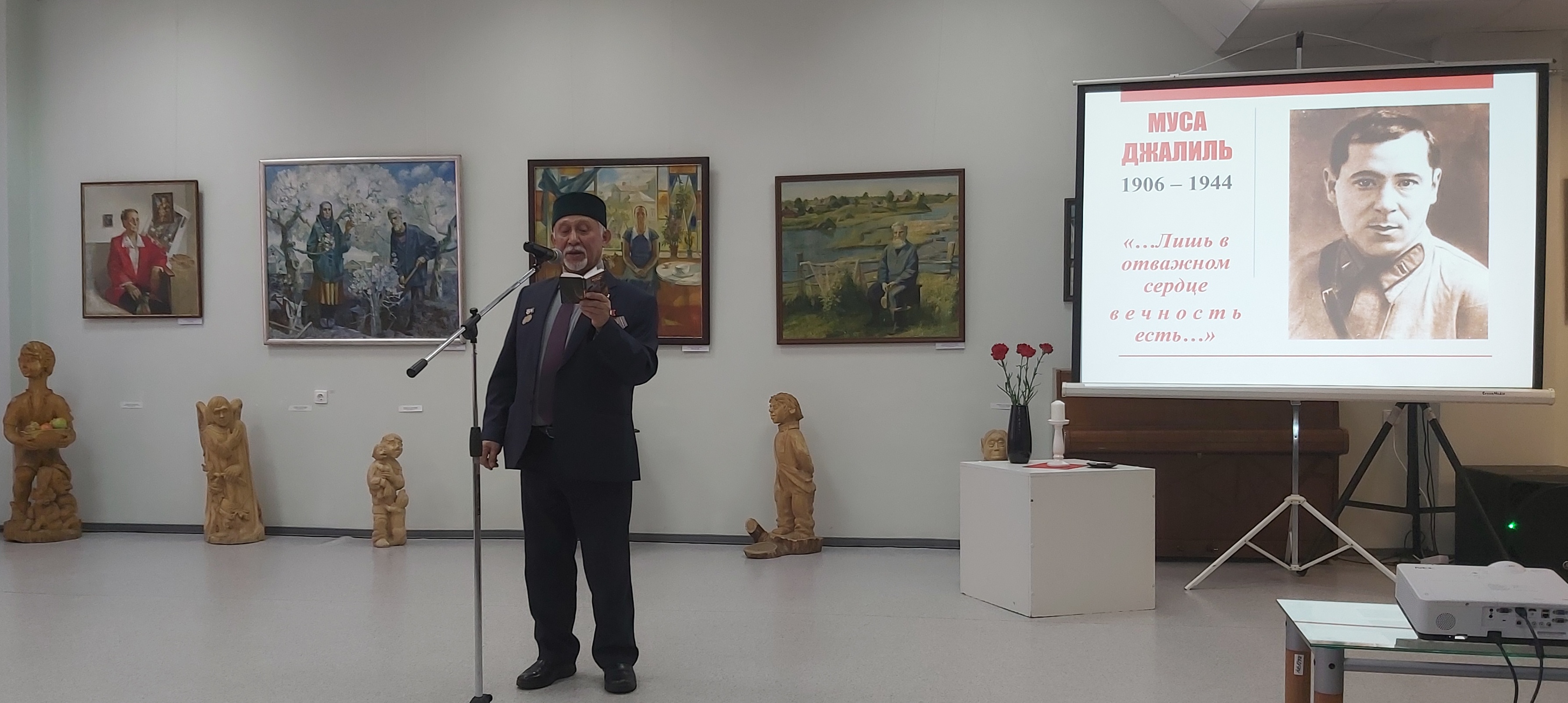 Продолжилось мероприятие в выставочном зале Дворца культуры тематическим вечером «…Лишь в отважном сердце вечность есть…». Перед гостями выступили председатель татарского общества «Иге юл», заслуженный работник культуры РФ и РТ Иняятулла Кутуев, творческие деятели и все желающие прочитали стихи поэта.