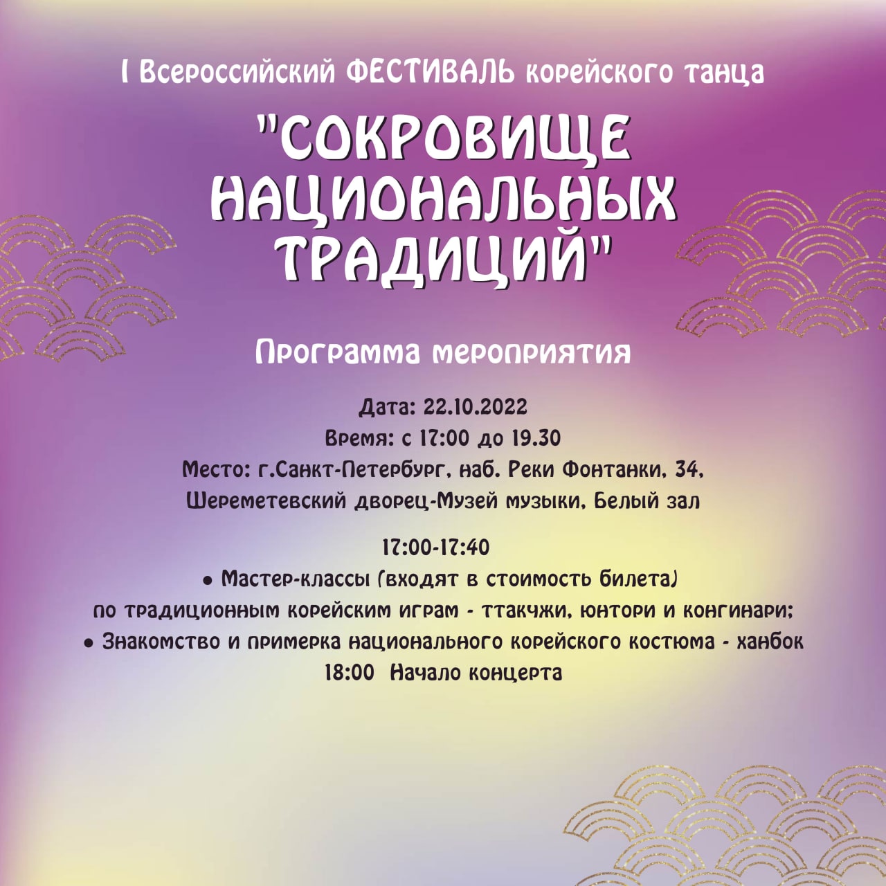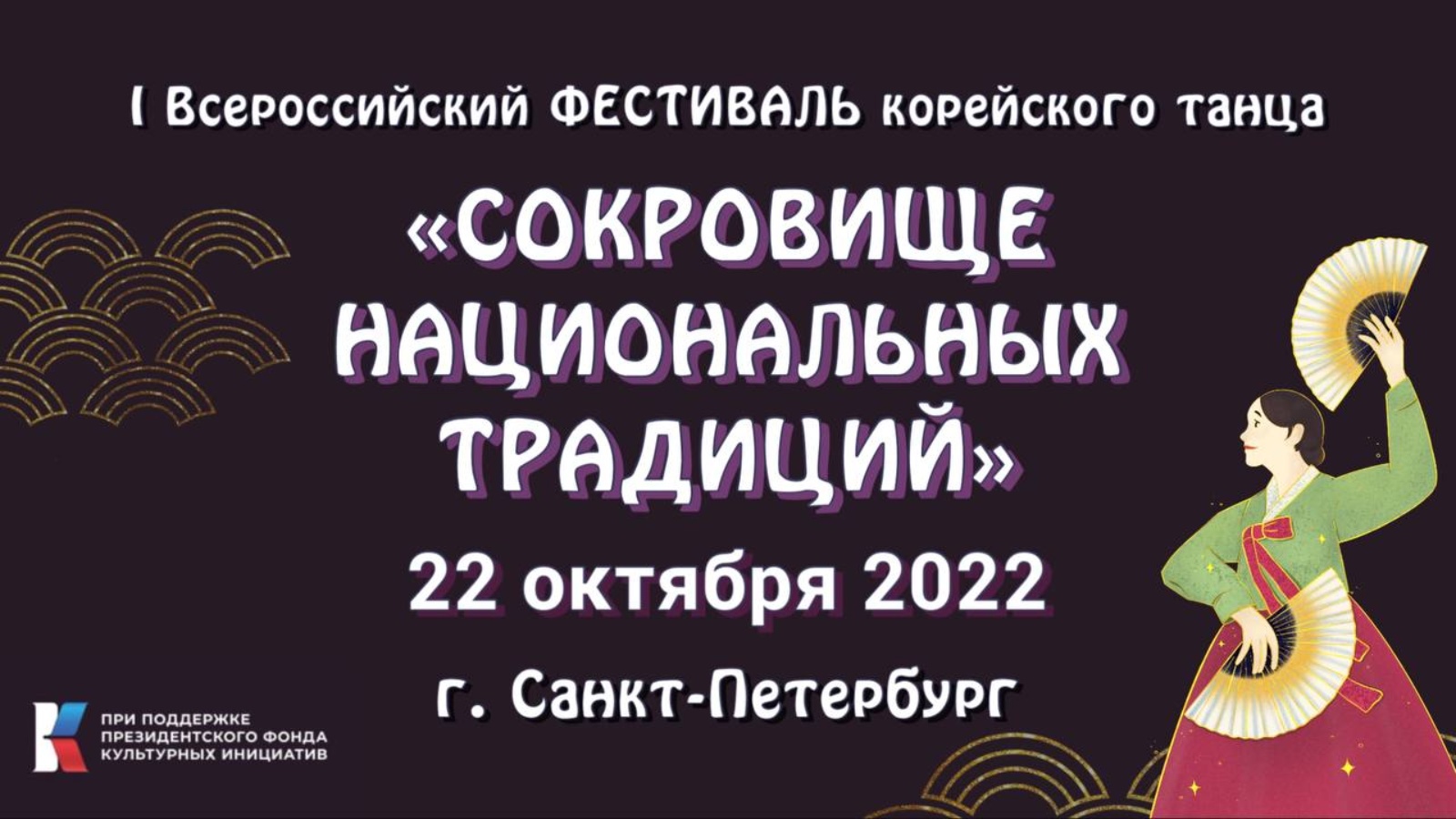 22 и 23 октября 2022 г. в Санкт-Петербурге будет проходить I Всероссийский Фестиваль корейского танца «Сокровище национальных традиций».