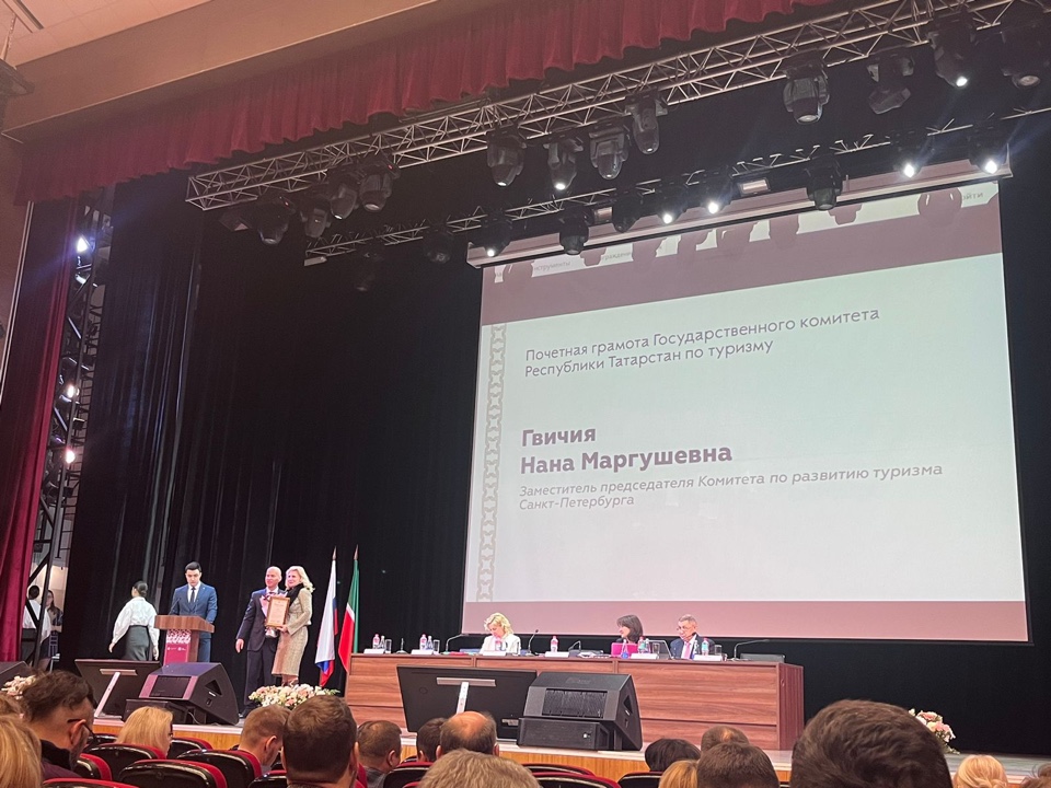 Завершилось мероприятие церемонией награждения, где за развитие межрегионального сотрудничества почетной грамотой Государственного комитета Республики Татарстан по туризму отмечена заместитель председателя Комитета по развитию туризма Санкт-Петербурга Нана Гвичия.