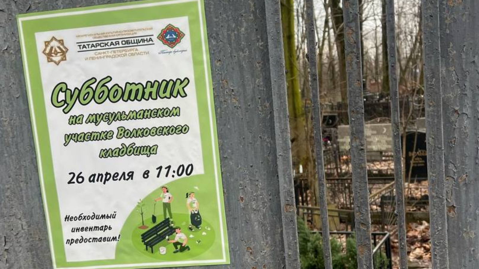26 апреля в 11:00 пройдет субботник по уборке территории на мусульманском участке Волковского кладбища. Субботник уже стал традиционным и ежегодным, в котором принимают участие татарские общественные организации Санкт-Петербурга и Ленинградской области.