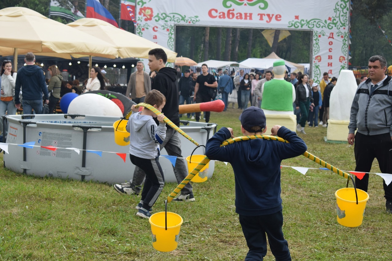 Для любителей активного отдыха организовали традиционные виды татаро-башкирских игр и соревнований: борьба на поясах, бои на подушках, разбивание кувшина с завязанными глазами, забег с коромыслами, силовые соревнования и другие.