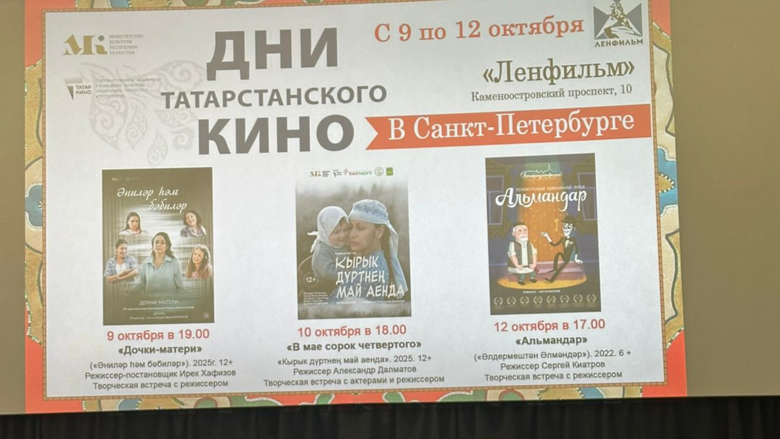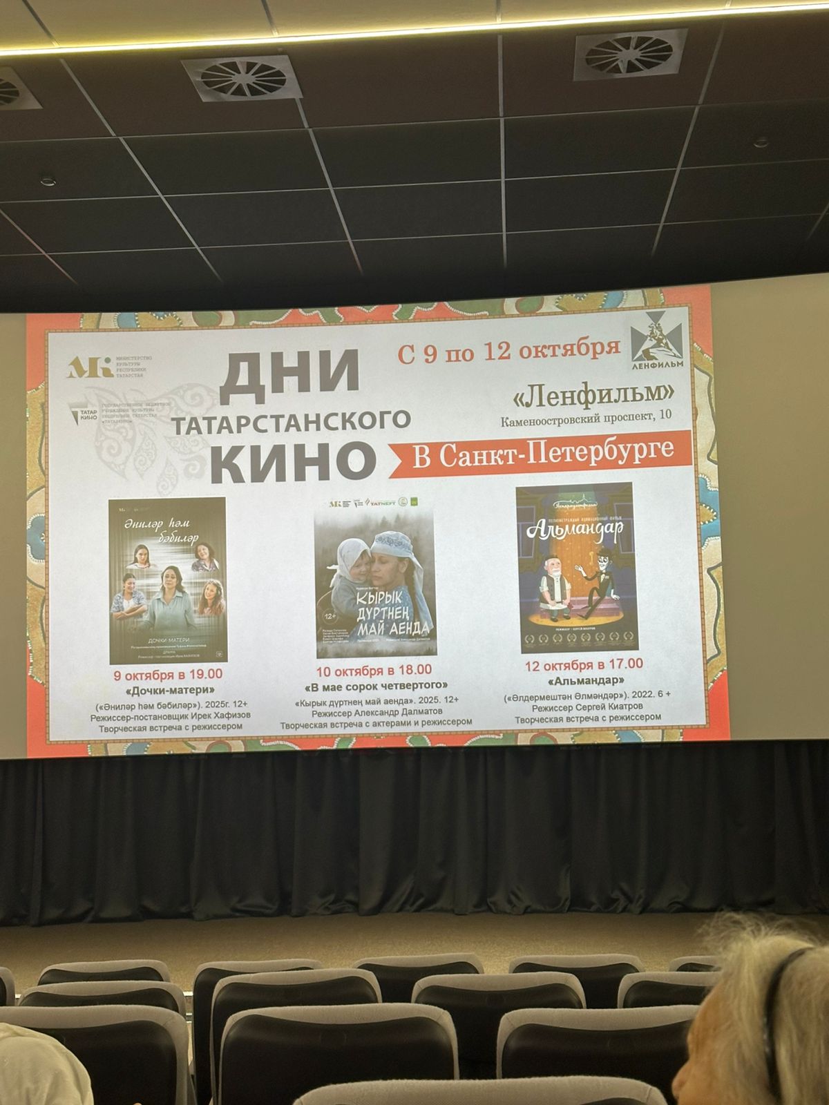 В Санкт-Петербурге на «Ленфильме» успешно завершился спецпоказ татарского кино, который прошел с 9 по 12 октября. Каждый вечер был посвящен уникальной истории и собирал зрителей для живого обсуждения с создателями картин.