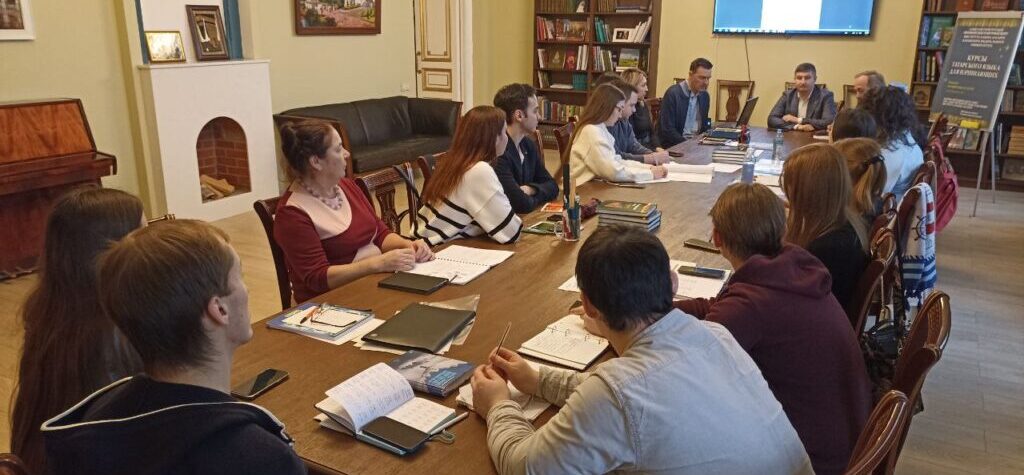 Курсы татарского языка на ул. Чайковского за последнее время приобрели необычайную популярность: заниматься татарским языком ходят десятки человек, вследствие чего учебной группе пришлось переместиться из небольшого класса Института Каюма Насыри в большой каминный зал (но даже и там не всегда всем хватает места за длинным столом). Преподаватель этих курсов – Фирая Ильгизаровна Рашитова использует свой большой опыт и новометодные подходы, что позволило ей собрать вокруг себя группу истинных ценителей татарского языка, желающих его изучать, чтобы разговаривать на нём со своими родственниками и друзьями. Поскольку вследствие некоторых проблем она временно не может исполнять свои обязанности, за организацию этой встречи взялись её верные помощники филологи Артём Кураев и Алла Панова. Они же пригласили на эту встречу меня – автора учебника «Татарский язык с нуля: самоучитель для начинающих», который по мере возможности и необходимости также участвует в жизни этих курсов.