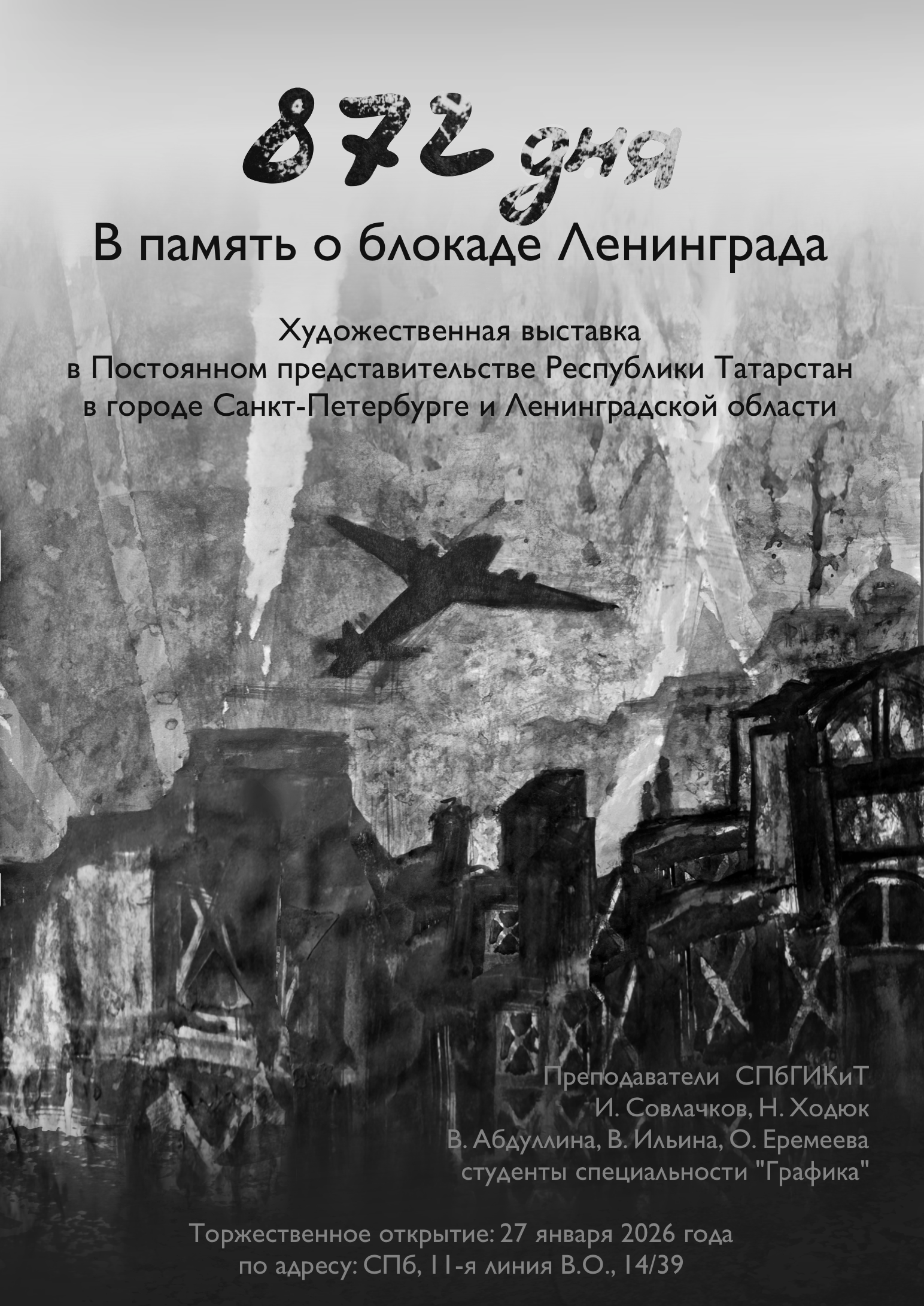 27 января, в День полного освобождения Ленинграда от блокады, в Постоянном представительстве Республики Татарстан в городе Санкт-Петербурге и Ленинградской области, официально открывается небольшая тематическая выставка художественных работ «872 дня», подготовленная преподавателями и студентами Санкт-Петербургского государственного института кино и телевидения (СПбГИКиТ).