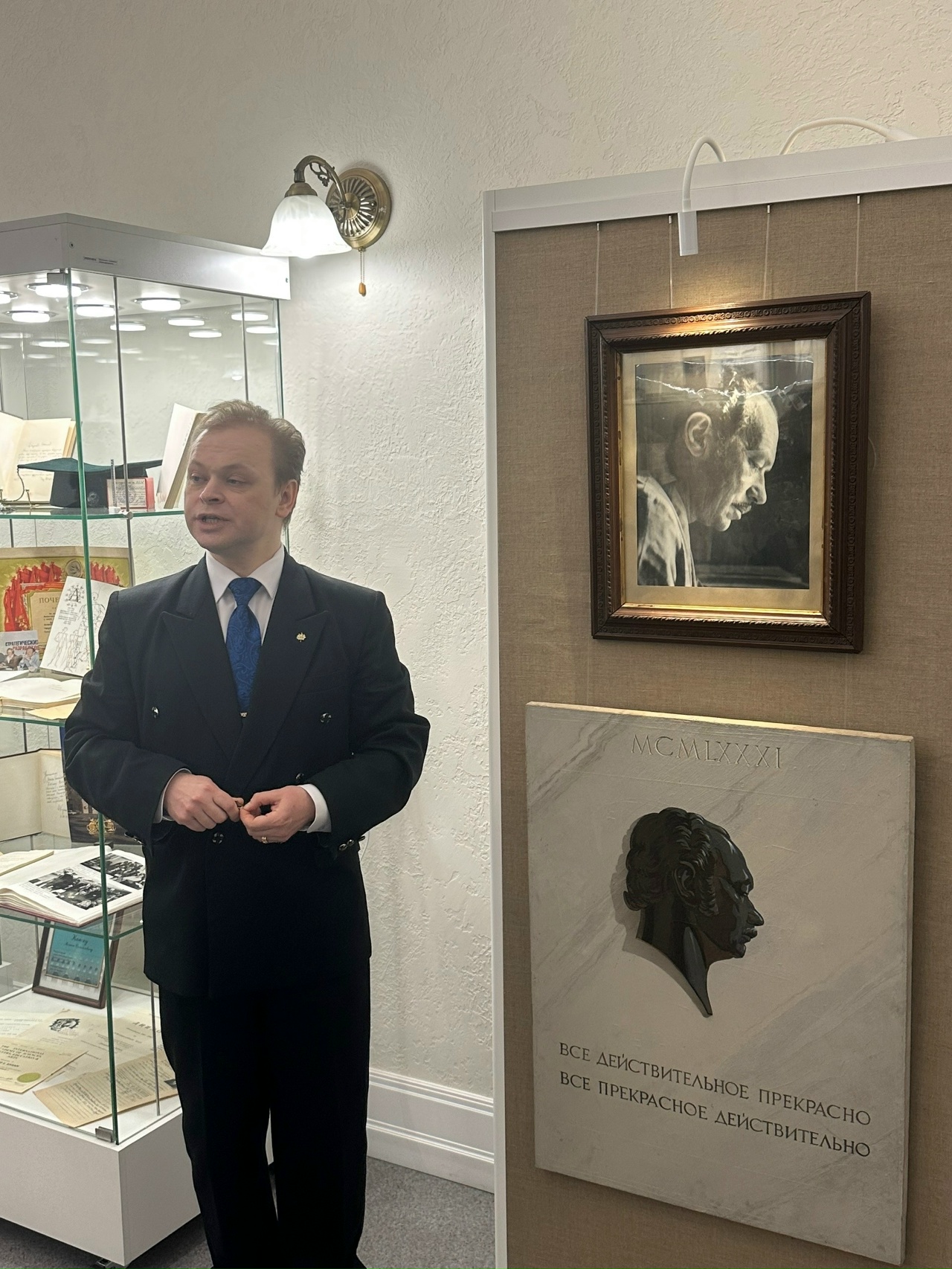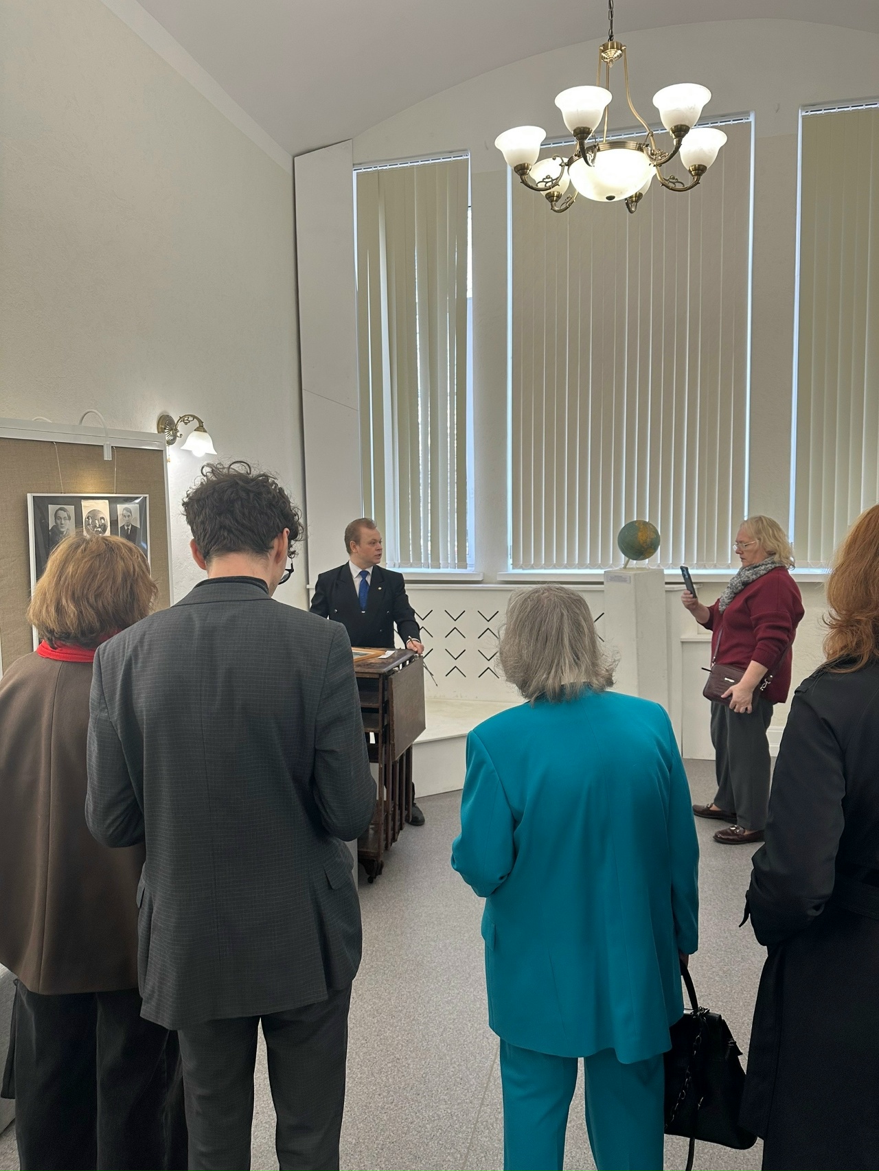 Была проведена экскурсия по экспозиции, в ходе которой гостей ознакомили с подлинными мемориальными предметами из частных коллекций М.Г. Козыревой, Е.В. Масловой и С.И. Сенина, а также с материалами из научного архива М.С. Кагана и личных библиотек А.Я. Флиера и А.В. Бондарева.